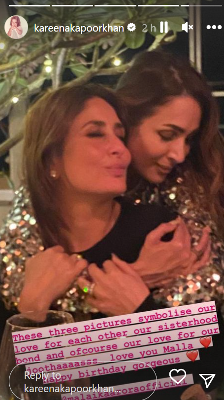 दूसरी फोटो में करीना और मलाइका मस्ती करते हुए दिखाई दे रही हैं। इन फोटोज को शेयर करते हुए एक्ट्रेस ने कैप्शन में लिखा 'ये तीन तस्वीरें एक-दूसरे के लिए हमारा प्यार, हमारा सिस्टरहुड बॉन्ड और joothaaaasss के लिए हमारा प्यार। लव यू मल्ला। हैप्पी बर्थडे डे गॉर्जियस।