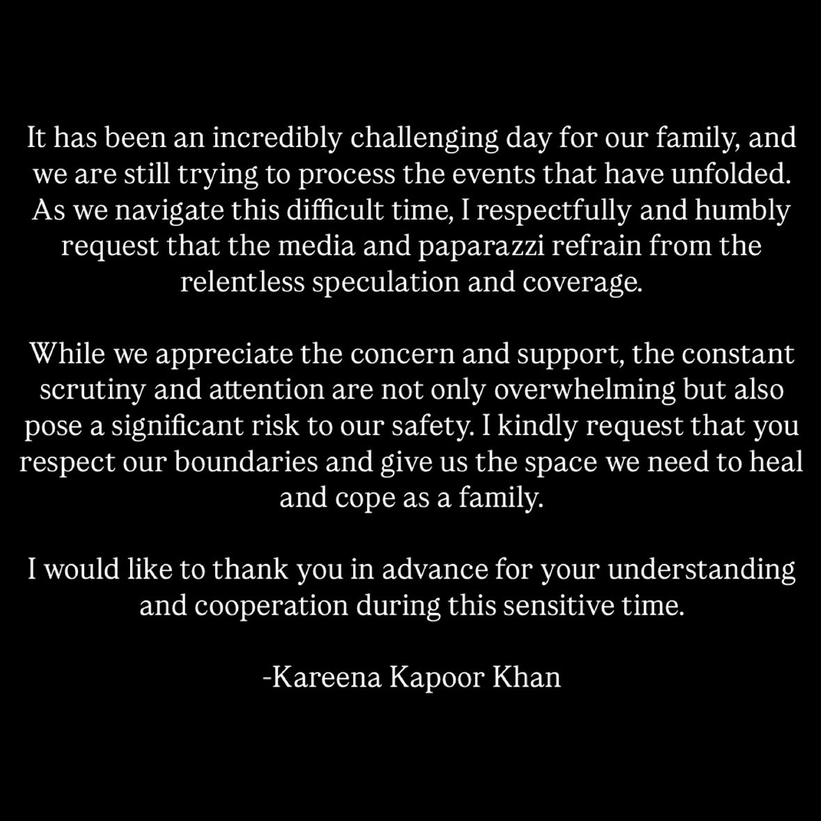 करीना ने लिखा- हमारे परिवार के लिए ये काफी चुनौतपूर्ण दिन था। हम अभी भी चीजों को प्रोसेस करने की कोशिश ही कर रहे हैं। सोच रहे हैं कि आखिर ये सब हो कैसे गया। इस मुश्किल समय में, मैं मीडिया और पैपराजी से गुजारिश करना चाहती हूं कि किसी भी तरह की अफवाह को न बढ़ाएं। साथ ही ऐसी कोई कवरेज न करें जो सही नहीं है।
