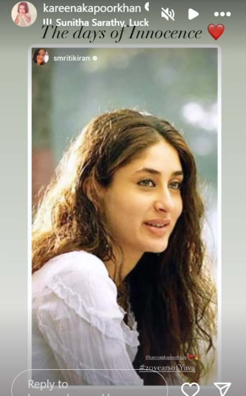 करीना कपूर खान ने अपनी फिल्म युवा के 20 साल पूरे होने का जश्न मनाने के लिए सोशल मीडिया का सहारा लिया। अभिनेत्री ने मासूमियत के दिनों को याद करते हुए एक पुरानी पुरानी तस्वीर शेयर की। फिल्म का नाम था युवा जिसे मणिरत्नम ने डायरेक्ट किया था। युवा 2004 में रिलीज हुई थी और इसमें अजय देवगन अभिषेक बच्चन रानी मुखर्जी और विवेक ओबेरॉय नजर आए थे।