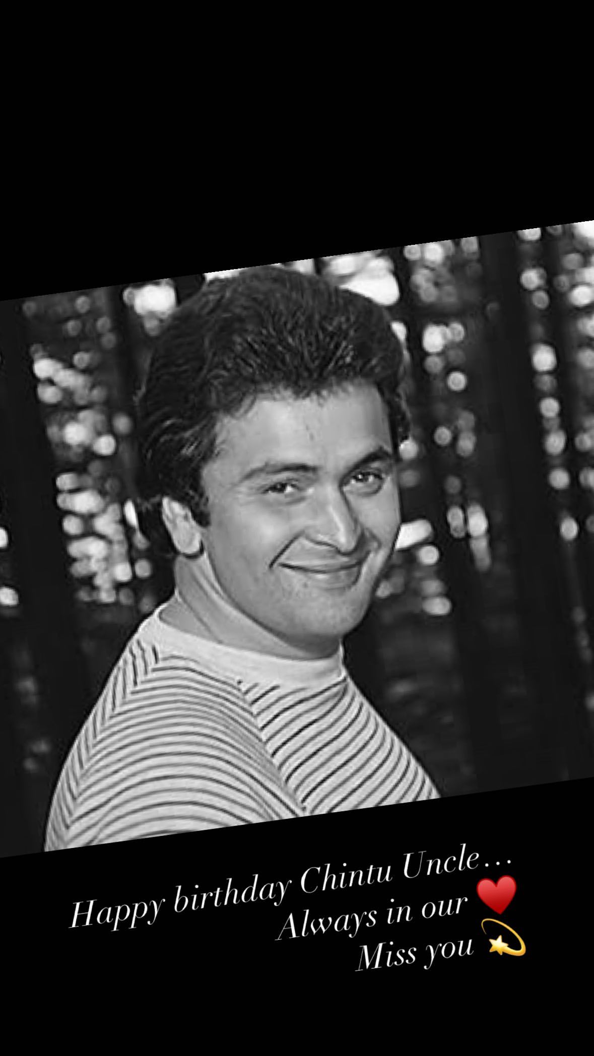 करीना कपूर खान दिवंगत अभिनेता ऋषि कपूर की भतीजी हैं। एक्ट्रेस ने अपने सोशल मीडिया अकाउंट इंस्टाग्राम पर एक ऋषि कपूर की पुरानी तस्वीर शेयर की है। फोटो शेयर करते हुए उन्होंने कैप्शन में लिखा 'हैप्पी बर्थडे चिंटू अंकल, हमेशा हमारे दिल में, आपकी याद आएगी'।