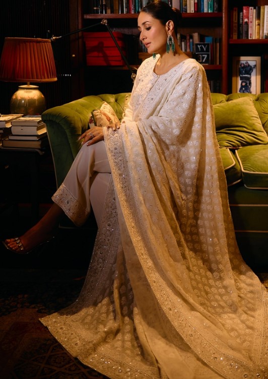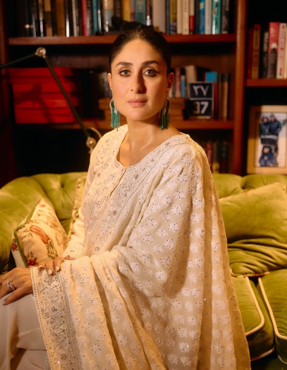 करीना कपूर ने ऑफ व्हाइट चूड़दार में अपने घर में ही फोटोशूट कराया है। 43 की उम्र में भी उनकी फिटनेस देख लोगों को यकीन नहीं हो रहा कि वह दो बेटों की मां हैं। कभी काउच पर बैठे, कैमरे की तरफ देखते हुए, तो कभी महारानी पोज में करीना ने फोटो क्लिक कराई।