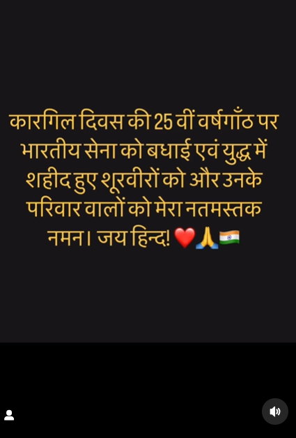 अनुपम खेर (Anupam Kher) ने अपने सोशल मीडिया हैंडल इंस्टाग्राम पर कारगिल विजय दिवस की 25वीं वर्षगांठ पर पोस्ट किया है। इसमें उन्होंने लिखा है कि कारगिल दिवस की 25 वीं वर्षगांठ पर भारतीय सेना को बधाई एवं युद्ध में शहीद हुए शूरवीरों को और उनके परिवार वालों को मेरा नतमस्तक नमन। जय हिन्द।