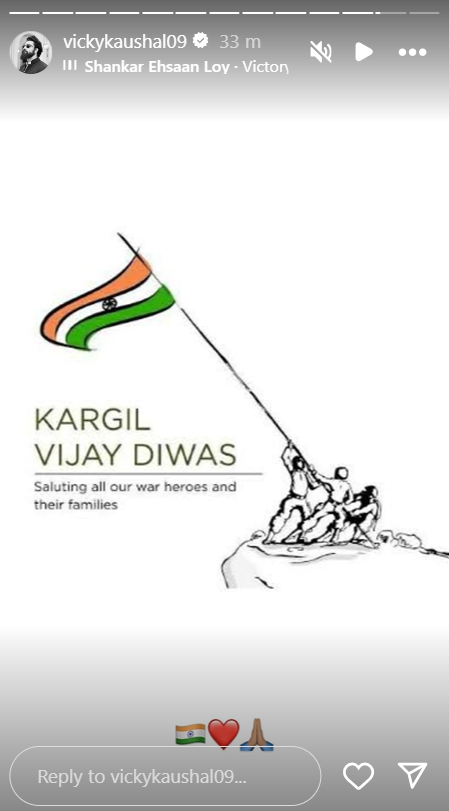 विक्की कौशल ने भी अपने सोशल मीडिया पर कारगिल विजय दिवस को लेकर पोस्ट किया है। सभी युद्ध के जवानों और उनके परिवार को नमन।