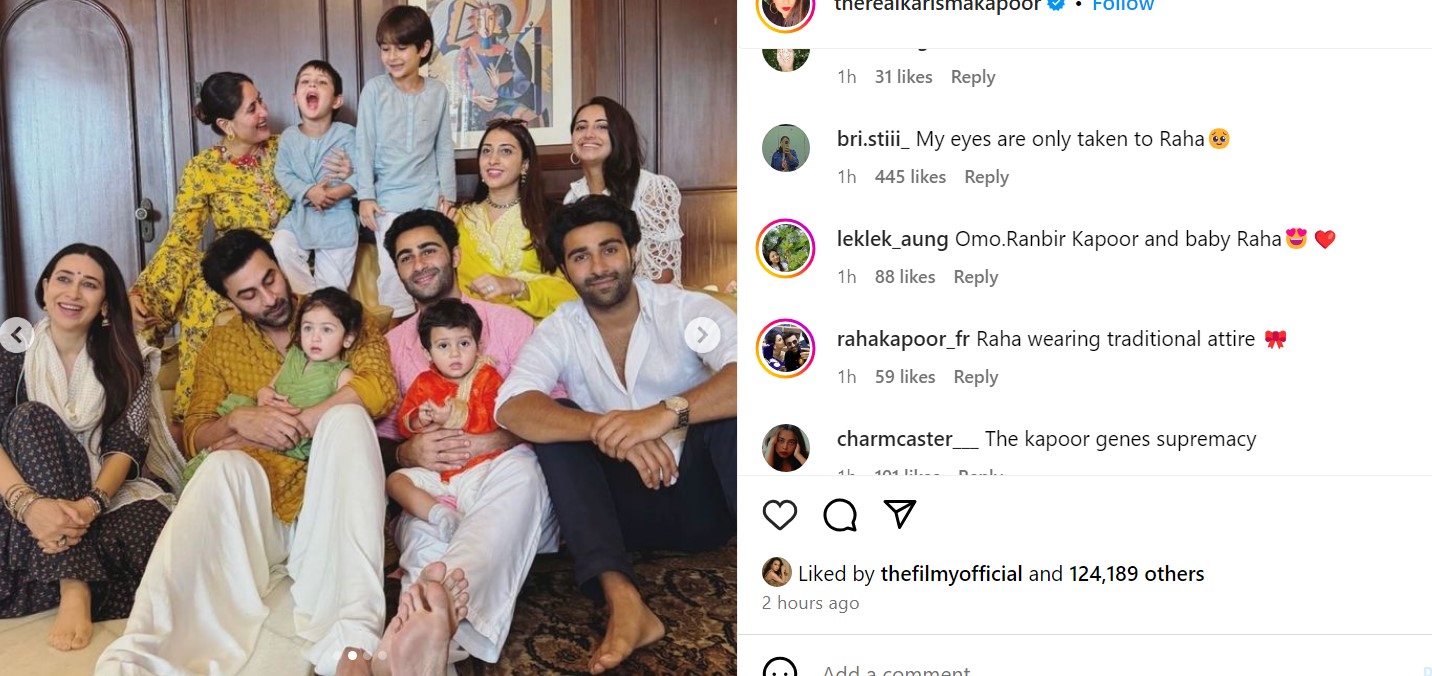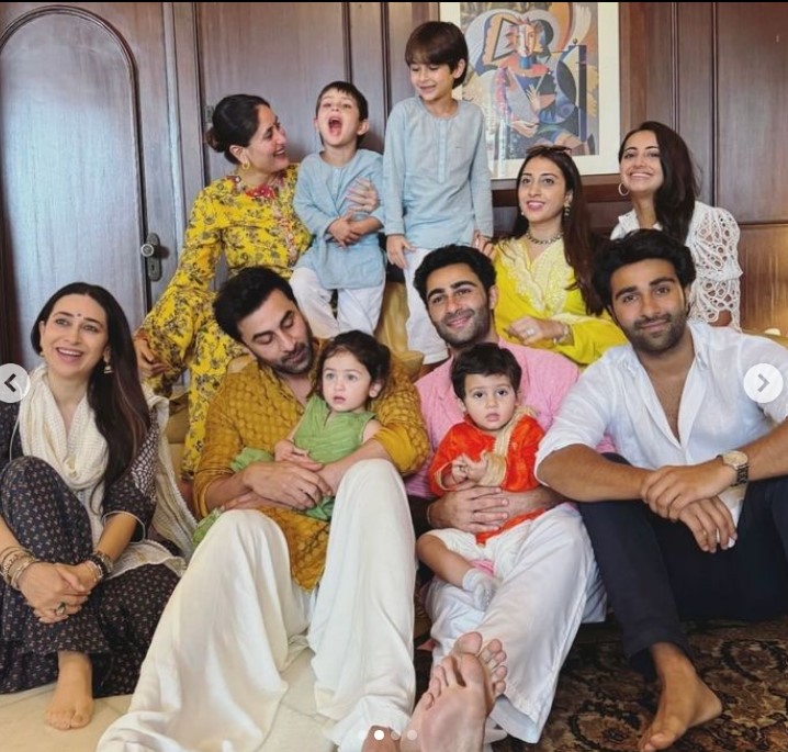 इन तस्वीरों में रणबीर की गोद में राहा नजर आ रही हैं, जिन्होंने ग्रीन कलर की ट्रेडिशनल ड्रेस पहनी है। राहा कैमरे की तरफ देख रही हैं और रणबीर अपनी बेटी की तरफ। इसी तस्वीर में करीना अपने बेटों के साथ मस्ती करती देखी जा सकती हैं।