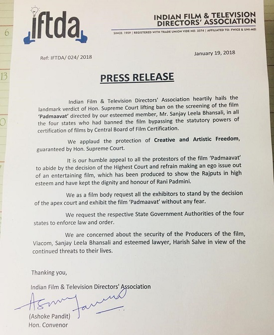 इस बीच इंडियन फिल्म एंड टेलीविजन डायरेक्टर्स एसोसिएशन ने सुप्रीम कोर्ट के पूरे देश में पद्मावत को रिलीज़ किये जाने का स्वागत करते हुए विरोध करने वालों से अपील की हैं कि वो अपने इगो को परे रख कर इस फिल्म का विरोध छोड़ दें क्योंकि ये फिल्म रानी पद्मिनी और राजपूती सम्मान को और बढ़ाने वाली है। संगठन ने सिनेमाघर मालिकों से इस फिल्म को बिना किसी डर के अपने यहां प्रदर्शित करने और राज्यों को क़ानून व्यवस्था को बनाये रखने के लिए हर संभव प्रयास करने की गुजारिश की है।