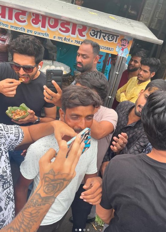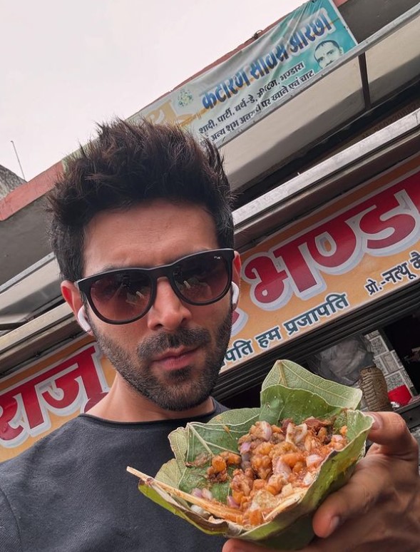 ओरछा में एक ठेले के सामने खड़े होकर कार्तिक ने चाट की फोटो शेयर की। इसके साथ ही कुछ फनी तस्वीरें भी शेयर कीं। एक्टर ने यहां आलू टिक्की और भेल का आनंद लिया।