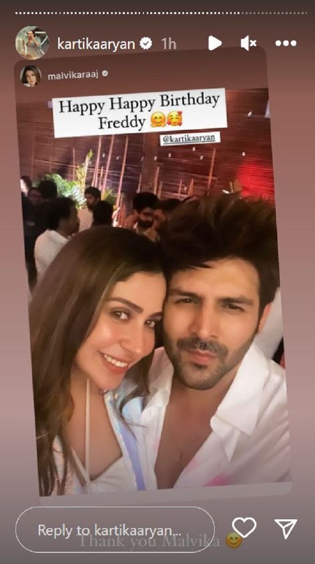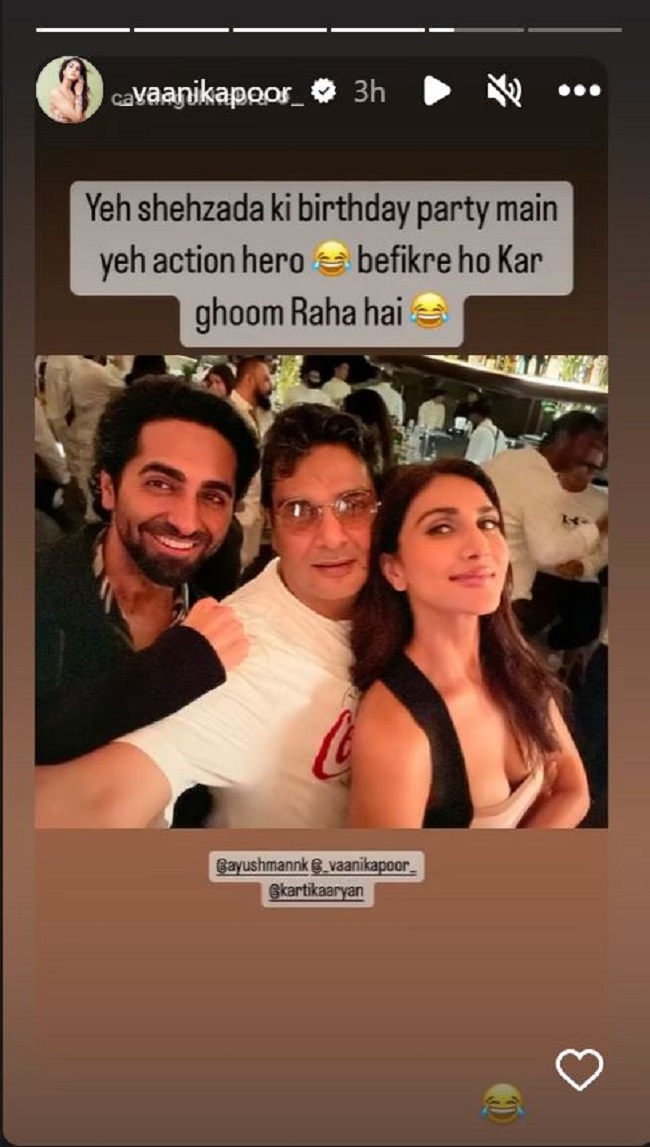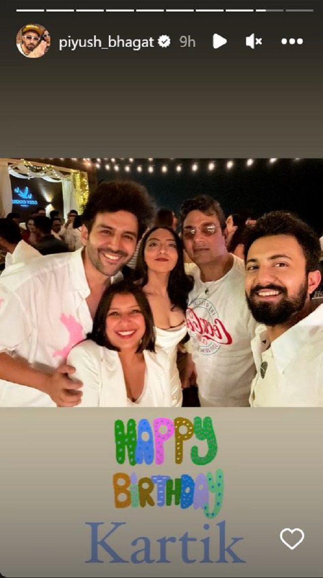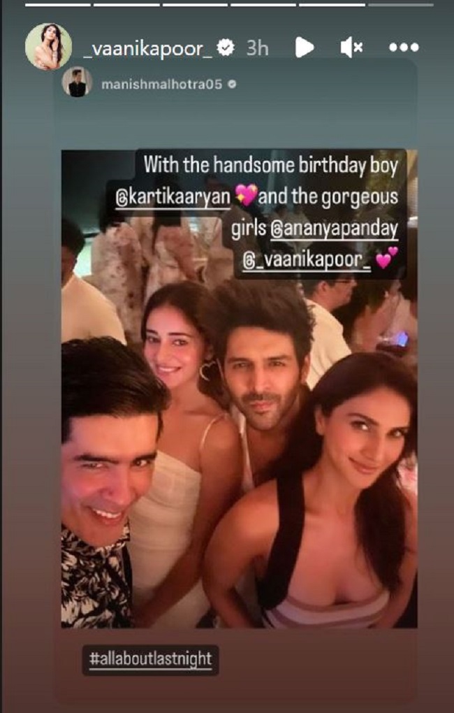 मनीष मल्होत्रा और वाणी कपूर ने कई तस्वीरें शेयर की हैं। मनीष मल्होत्रा को अनन्या पांडे, वाणी कपूर और बर्थडे ब्वॉय कार्तिक आर्यन के साथ पोज करते हुए देखा जा सकता है। इसके साथ उन्होंने लिखा है, 'हैंडसम बर्थडे ब्वॉय कार्तिक आर्यन और गॉर्जियस गर्ल अनन्या पांडे और बोनी कपूर के साथ पोज करते हुए देखा जा सकता है। वाणी कपूर ने तस्वीरें शेयर करते हुए लिखा है, 'यह शहजादा की बर्थडे पार्टी में यह एक्शन हीरो बेफिक्र होकर घूम रहा है।' इसमें उनके अलावा आयुष्मान खुराना भी नजर आ रहे हैं।' वहीं पियूष भगत ने भी कार्तिक आर्यन की पार्टी से तस्वीरें शेयर की है। इसमें कार्तिक आर्यन के अलावा मुकेश छाबड़ा के अलावा और भी कई लोग नजर आ रहे है।