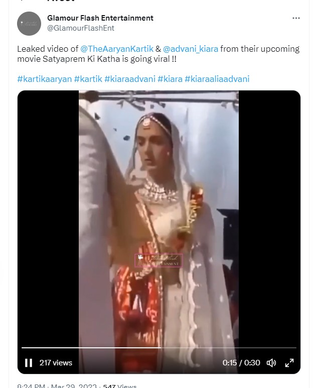 सामने आया वीडियो फिल्म के एक सीन का है, जिसमें दोनों शादी का सीन शूट करते नजर आ रहे हैं। इसमें देखा जा सकता है कि किरदार में घुसे कार्तिक मायूस नजर आ रहे हैं, तो वहीं कियारा भी इमोशनल हैं। दोनों के चेहरे पर कोई खुशी नहीं है। इस वीडियो को एक फैन पेज ने शेयर किया है।