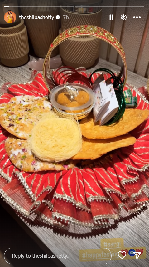 हर साल की तरह इस साल भी शिल्पा ने अपने पति राज कुंद्रा के लिए करवा चौथ का व्रत रखा है। शिल्पा ये व्रत पूरे रीति-रिवाजों से मनाती हैं। ऐसे में उन्होंने इंस्टाग्राम स्टोरी पर एक वीडियो साझा किया है, जिसमें वह अपनी सरगी की झलक दिखा रही हैं। जो उन्हें सुबह करीब चार बजे अपनी सास से मिली थी। सरगी में शिल्पा को घेवर, मिठाई से लेकर सोलह श्रृंगार का सामान मिला है।