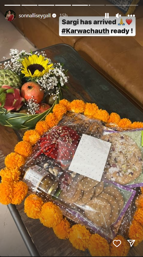 फिल्म 'प्यार का पंचनामा' एक्ट्रेस सोनाली सहगल ने भी इसी साल शादी रचाई थी। वह भी शादी के बाद अपना पहला करवा चौथ सेलिब्रेट कर रही है। ऐसे में एक्ट्रेस ने अपने हाथों पर पति के नाम की मेहंदी भी लगवाई है। करवा चौथ की पहली सरगी में एक्ट्रेस को खीर-मिठाई, मिट्ठी-पापड़ी जैसी चीजें मिली।