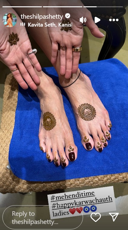 शिल्पा शेट्टी सारे फेस्टिवल धूमधाम से मनाती हैं। चाहे होली हो या गणेश चतुर्थी, एक्ट्रेस किसी भी त्योहार में बढ़चढ़ कर हिस्सा लेती हैं। उनका करवा चौथ सेलिब्रेशन भी हर बार चर्चा में रहता है। शिल्पा ने अपनी सरगी और मेहंदी की झलक दिखाई है।