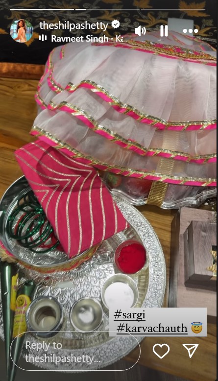 एक्ट्रेस ने सरगी का वीडियो शेयर किया है। उनकी सरगी में मेहंदी, सिंदूर और हरी-लाल चूड़ियां हैं। इसके साथ ही कुछ मीठा और अन्य खाने की चीजें भी हैं।