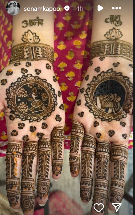 फैशन क्वीन मानी जाने वालीं सोनम कपूर ने हाथों में पति और बेटे के नाम की मेहंदी रचाई है। बाएं हाथ में वायु, तो दाएं में आनंद का नाम लिखवाकर उन्होंने करवा चौथ के इस सेलिब्रेशन को पूरा किया है। इसी के साथ एक्ट्रेस ने बताया कि उन्होंने व्रत नहीं रखा है, लेकिन मेहंदी लगाना , तैयार होना, करवा चौथ का खाना उन्हें पसंद है।