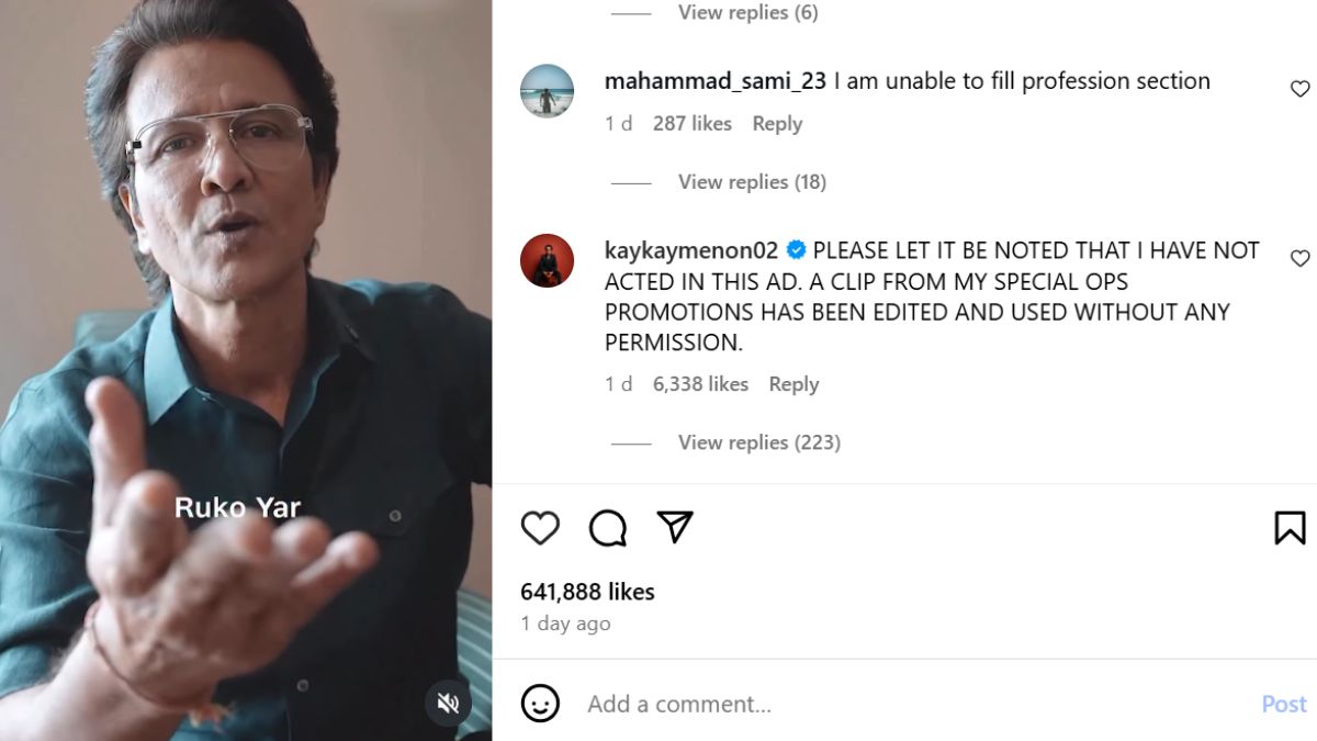 इस वीडियो के नीचे कई लोगों ने कमेंट करते हुए पूछा कि क्या सच में एक्टर इससे जुड़ गए हैं। अब के के मेनन ने खुद इस पोस्ट पर कमेंट करते हुए जवाब दिया है। उन्होंने लिखा, 'कृपया यह ध्यान दें कि मैंने इस विज्ञापन में काम नहीं किया है। मेरे स्पेशल ऑप्स के प्रमोशन के एक क्लिप उठाकर एडिट करके यहां यूज की गई है। इस क्लिप को मेरी परमिशन के बिना लिया गया है।