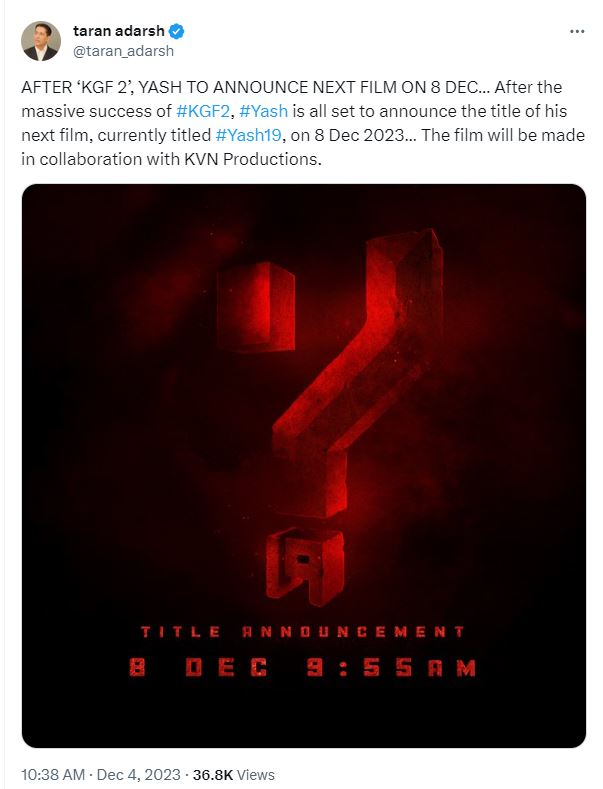 ट्रेड एनालिस्ट तरण आदर्श ने अपने अधिकारिक ट्विटर अकाउंट पर यश की अगली फिल्म की जानकारी शेयर करते हुए फैंस की बैचेनी को दोगुना बढ़ा दिया है। उन्होंने यश की नई फिल्म का अपडेट देते हुए लिखा, "केजीएफ 2 के बाद अब यश 8 दिसंबर को अपनी अगली फिल्म की घोषणा करने वाले हैं। केजीएफ 2 की सफलता के बाद वह जल्द ही अपनी अगली फिल्म का टाइटल अनाउंस करेंगे"।