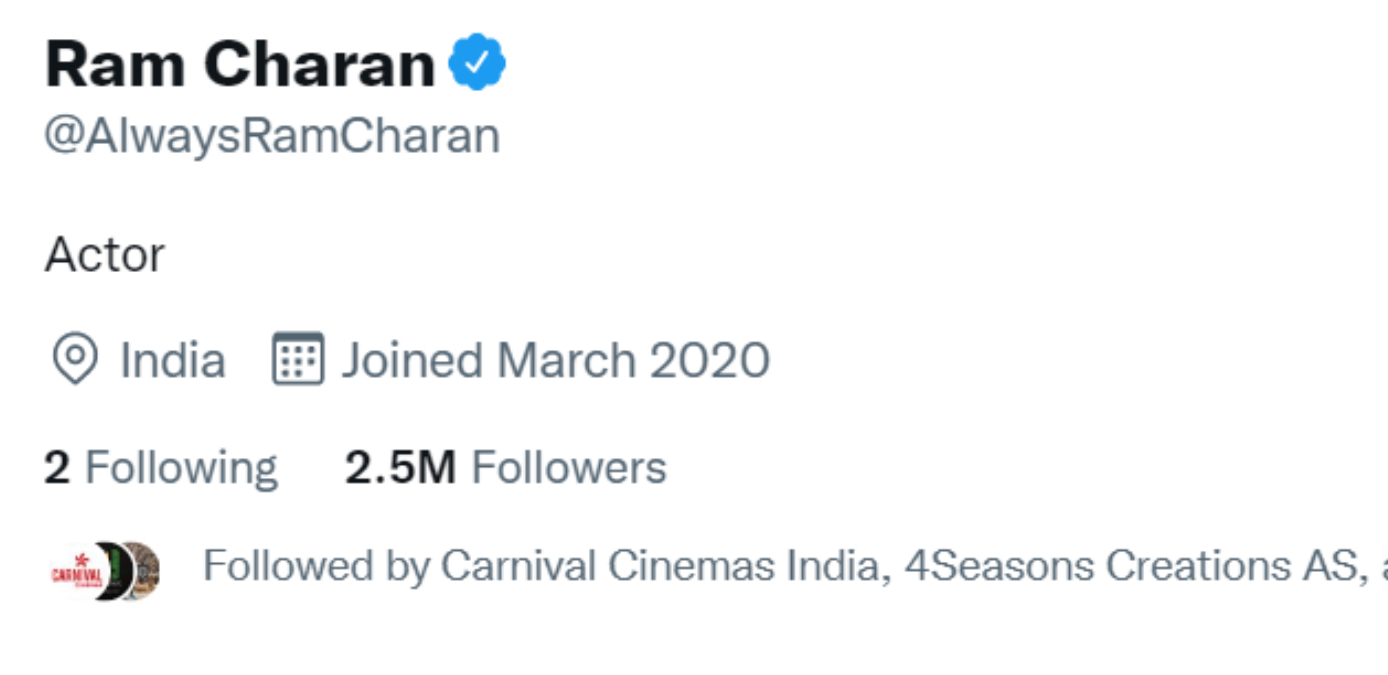 आरआरआर में जूनियर एनटीआर के को-स्टार और दोस्त राम चरण को 2.5 मिलियन लोग फॉलो करते हैं, मगर राम चरण सिर्फ दो लोगों को फॉलो करते हैं। उनके अंकल पवन कल्याण और पिता चिरंजीवी। राम चरण ने हिंदी सिनेमा में डेब्यू जंजीर के रीमेक जंजीर से किया था, जिसमें प्रियंका चोपड़ा उनकी लीडिंग लेडी थीं। यह फिल्म फ्लॉप रही थी।