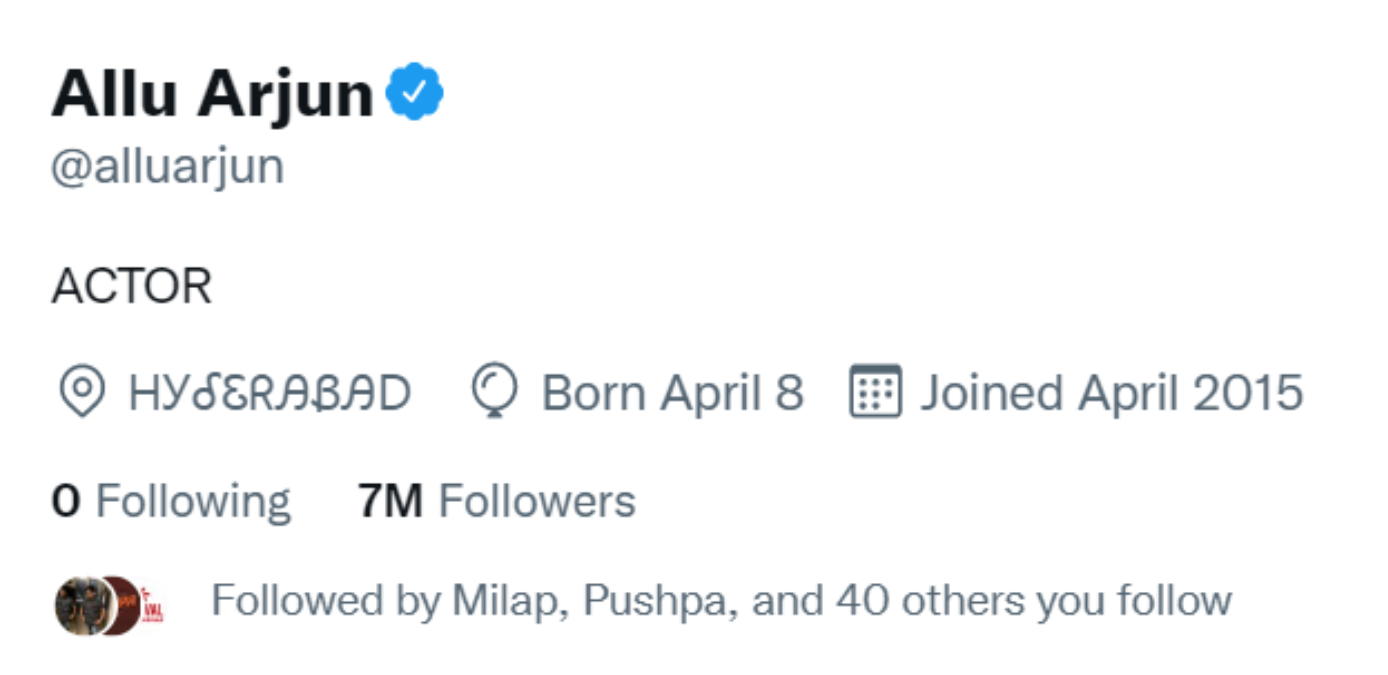 पुष्पा- द राइज से हिंदी बेल्ट में बेहद लोकप्रिय हो चुके अल्लू अर्जुन के सबसे अधिक 7 मिलियन फॉलोअर्स हैं और वो भी किसी को फॉलो नहीं करते। अल्लू ने अपने बायो में सिर्फ एक्टर लिखा है। बता दें, 17 दिसम्बर 2021 को रिलीज हुई पुष्पा के हिंदी वर्जन ने 100 करोड़ से अधिक कलेक्शन किया था। खास बात यह है कि अल्लू ने हिंदी बेल्ट में फिल्म का प्रमोशन भी नहीं किया। पुष्पा माउथ पब्लिसिटी के दम पर चली थी।