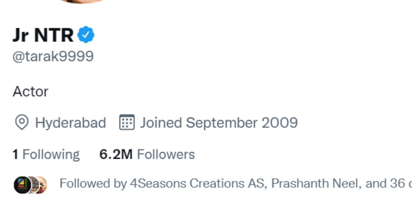 आरआरआर से हिंदी बेल्ट में डेब्यू करने वाले जूनियर एनटीआर तेलुगु के लोकप्रिय अभिनेता हैं। ट्विटर पर उनके 6.2 मिलियन फॉलोअर्स हैं। वहीं, वो सिर्फ एक व्यक्ति हो फॉलो करते हैं। वो कोई और नहीं, बल्कि आरआरआर के निर्देशक एसएस राजामौली हैं। जूनियर एनटीआर ने भी अपने बायो में सिर्फ एक्टर लिखा है।