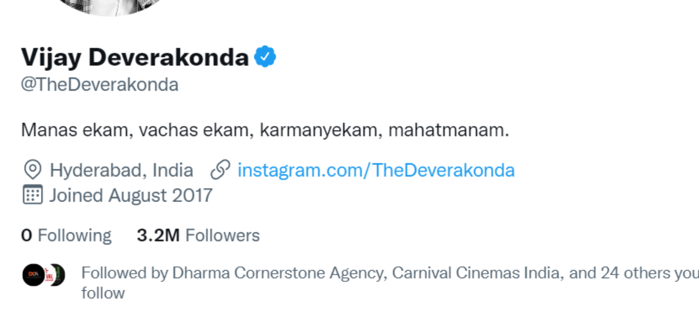 लाइगर से हिंदी सिनेमा में डेब्यू कर चुके विजय देवरकोंडा के 3.2 मिलियन फॉलोअर्स हैं, मगर वो भी किसी दूसरे कलाकार, नेता, दोस्त, परिवार या फैन क्लब को फॉलो नहीं करते। विजय ने अपने बायो में मानस एकम, वाचस एकम, कर्मन्येकम, महात्मनम लिखा है। विजय तेलुगु के बेहद लोकप्रिय स्टार हैं। हालांकि, लाइगर बुरी तरह असफल रही है।