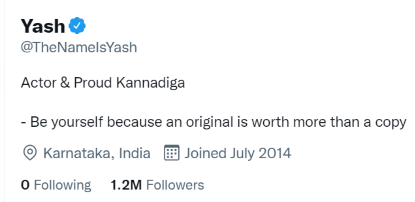 यश के ट्विटर पर 1.2 मिलियन फॉलोअर्स हैं, मगर वो खुद किसी को फॉलो नहीं करते। यश अपनी बायो में खुद के कन्नड़ होने पर गर्व करे हैं। उनका स्टेटस है- जैसे हैं वैसे रहिए, क्योंकि ओरिजिनल की कीमत कॉपी से अधिक होती है और शायह यही फिलॉसफी यश को कामयाबी की ओर लेकर गयी है।