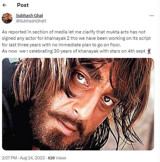 कई मीडिया वर्ग में ये कहा गया है, तो मैं इसे क्लियर कर दूं कि मुक्ता आर्ट्स ने खलनायक 2 के लिए अभी किसी भी एक्टर को कास्ट नहीं किया है। हम लास्ट 3 साल से इस फिल्म की स्क्रिप्ट पर काम कर रहे हैं। अभी फिल्म के साथ फ्लोर पर जाने का हमारा कोई प्लान नहीं है। हम स्टारकास्ट के साथ खलनायक के 30 साल सेलिब्रेट कर रहे हैं।