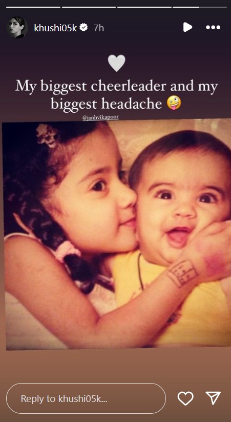 खुशी ने दूसरी फोटो भी शेयर की, जिसमें जाह्नवी उन्हें किस करती नजर आ रही हैं। इस फोटो के कैप्शन में खुशी ने लिखा, 'मेरी सबसे बड़ी चियरलीडर और सिरदर्द।' इसके साथ उन्होंने व्हाइट हार्ट इमोजी बनाई है।