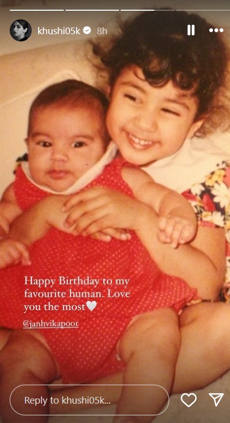 जाह्नवी कपूर अपनी छोटी बहन के साथ खूबसूरत बॉन्ड शेयर करती हैं। वह अक्सर उनकी तारीफ भी करती हैं। अपने बहन के स्पेशल डे पर खुशी ने उनके साथ बचपन की तस्वीरें शेयर की हैं, जिसमें जाह्नवी अपनी बहन के साथ खेलते हुए नजर आ रही हैं। बचपन की तस्वीरों को शेयर करते हुए खुशी ने एक में लिखा, 'मेरे पसंदीदा ह्यूमन बींग को जन्मदिन की बधाई हो। आई लव यू द मोस्ट।'