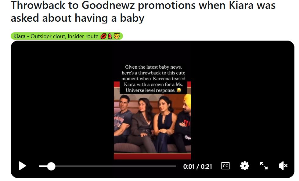 रेडिट के इस वायरल हो रहे वीडियो में, फरीदून (इंटरव्यू करने वाले) ने कियारा से पूछा कि वह जुड़वा बच्चों में किस तरह के पेयरिंग पसंद करेंगी- दो लड़कियां, दो लड़के, या एक लड़का और लड़की। इस सवाल पर कियारा ने जवाब दिया, 'मैं सिर्फ दो स्वस्थ बच्चे चाहती हूं जो भगवान मुझे गिफ्ट में दे सकें।' करीना कपूर एक्ट्रेस के इस जवाब की चुटकी लेते हुए कहती हैं कि यह मिस यूनिवर्स के जवाब जैसा लग रहा था। कियारा फिर आगे कहती हैं कि वह एक लड़की और एक लड़का चाहती हैं।