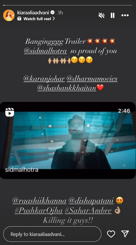 कियारा आडवाणी (Kiara Advani) ने इंस्टाग्राम स्टोरी पर पति सिद्धार्थ मल्होत्रा की फिल्म योद्धा (Yodha) का ट्रेलर शेयर करते हुए लिखा, "बैंगिंगगग ट्रेलर। सिद्धार्थ मल्होत्रा मुझे आप पर बहुत गर्व है। इसी के साथ एक्ट्रेस ने कई किस वाले इमोजी भी बनाए। इसके अलावा एक्ट्रेस ने फिल्म एक्ट्रेस राशि खन्ना, दिशा पटानी और निर्देशक पुष्कर ओझा और सागर अम्ब्रे को टैग करते हुए लिखा, "किलिंग इट गाइज़"।