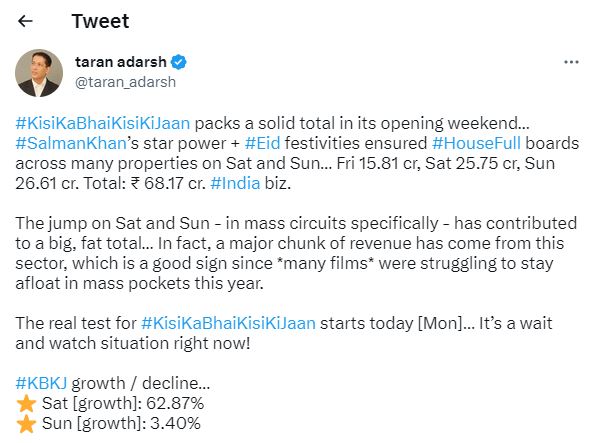 नई दिल्ली, जेएनएन। Kisi Ka Bhai Kisi Ki Jaan Ott Release: सलमान खान की ईद पर रिलीज हुई फिल्म 'किसी का भाई, किसी की जान' को भले ही समीक्षकों की मिली जुली प्रतिक्रिया मिली हो, लेकिन बॉक्स ऑफिस पर दबंग खान की फिल्म ने वीकेंड पर ही दमदार कमाई कर ली है।