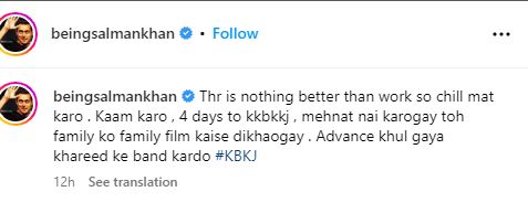 इस फोटो को शेयर करते हुए सलमान खान ने कैप्शन में लिखा, 'काम से बढ़कर कुछ भी नहीं है, तो चिल मत करो, काम करो। किसी का भाई, किसी की जान को बस चार दिन रह गए हैं, मेहनत नहीं करोगे, तो परिवार को फिल्म कैसे दिखाओगे। एडवांस खुल गए खरीद के बंद कर दो'।