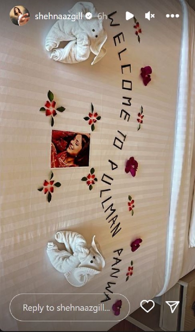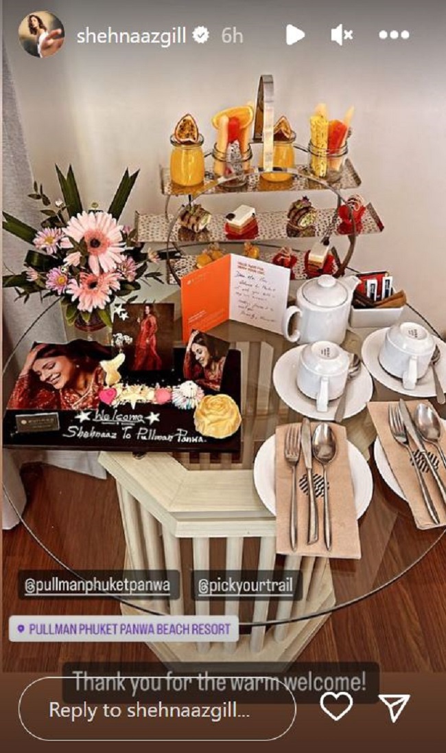 शहनाज गिल ने तस्वीरें शेयर करते हुए लिखा है, "फुकेट आई हूं। पेट पूजा कर रही हूं।" उन्होंने फुकेट में रिसोर्ट को टैग भी किया है। शहनाज गिल ने अपने रूम की तस्वीरें भी शेयर की हैं। इसमें हाथ से लिखा हुआ नोट उनके टेबल पर रखा हुआ है। उनका काफी धमाकेदार स्वागत किया गया है। शहनाज गिल ने अपने बेड की भी तस्वीरें शेयर की हैं। इसमें टावेल से बने हुए दो हाथियों को रखा गया है। उनके कमरे में कई फूल भी रखे हुए है।