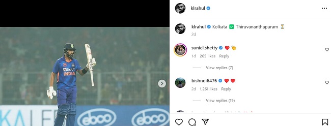 इसके पहले भारत और श्रीलंका के बीच ईडन गार्डन में खेले गए मैच में केएल राहुल ने शानदार पारी खेलते हुए भारत को जीत दिलाई थी। उनकी बल्लेबाजी के कारण ही भारत 4 विकेट से मैच जीत पाया था। इसके बाद उन्होंने इंस्टाग्राम पर मैच जीतने के बाद की तस्वीर शेयर की थी। उन्होंने लिखा था, 'कोलकाता हो गया तिरुअनंतपुरम बाकी है।' उनकी तस्वीर के बाद सुनील शेट्टी ने प्रतिक्रिया दी।