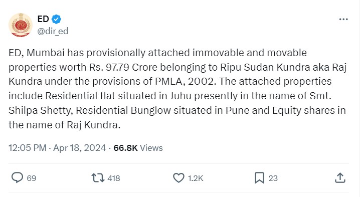 शिल्पा शेट्टी के कारोबारी पति राज कुंद्रा एक बार फिर कानूनी पचड़े में फंस गए हैं। एडल्ट फिल्मों के बाद अब उन पर बिट क्वाइन मामले में आरोप लगे हैं। ED यानी प्रवर्तन निदेशालय ने राज कुंद्रा की 97.79 करोड़ की संपत्ति जब्त कर दी है। इनमें उनका जुहू वाला बंगला भी शामिल है दो शिल्पा शेट्टी के नाम पर है।