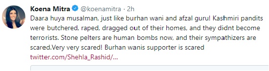 उन्होंने सोशल मीडिया पर लिखा है, 'अफजल गुरु और बुरहान वानी की तरह डरा हुआ है मुसलमान! कश्मीरी पंडितों का खुलेआम कत्लेआम किया गया। उनकी पत्नियों-बच्चियों का दिनदहाड़े बलात्कार किया गया। उन्हें दिनदहाड़े घर से निकाल दिया गया लेकिन वह आतंकवादी नहीं बने। पत्थर फेंकने वाले अब चलते फिरते मानव बम बन गए हैं और उनके साथ दया भाव रखने वाले अब डरे हुए हैं। बहुत बहुत डरे हुए हैं। बुरहान वानी के समर्थक डरे हुए हैं।' हालांकि कोएना ने यह ट्विट डीलिट कर दिया है।