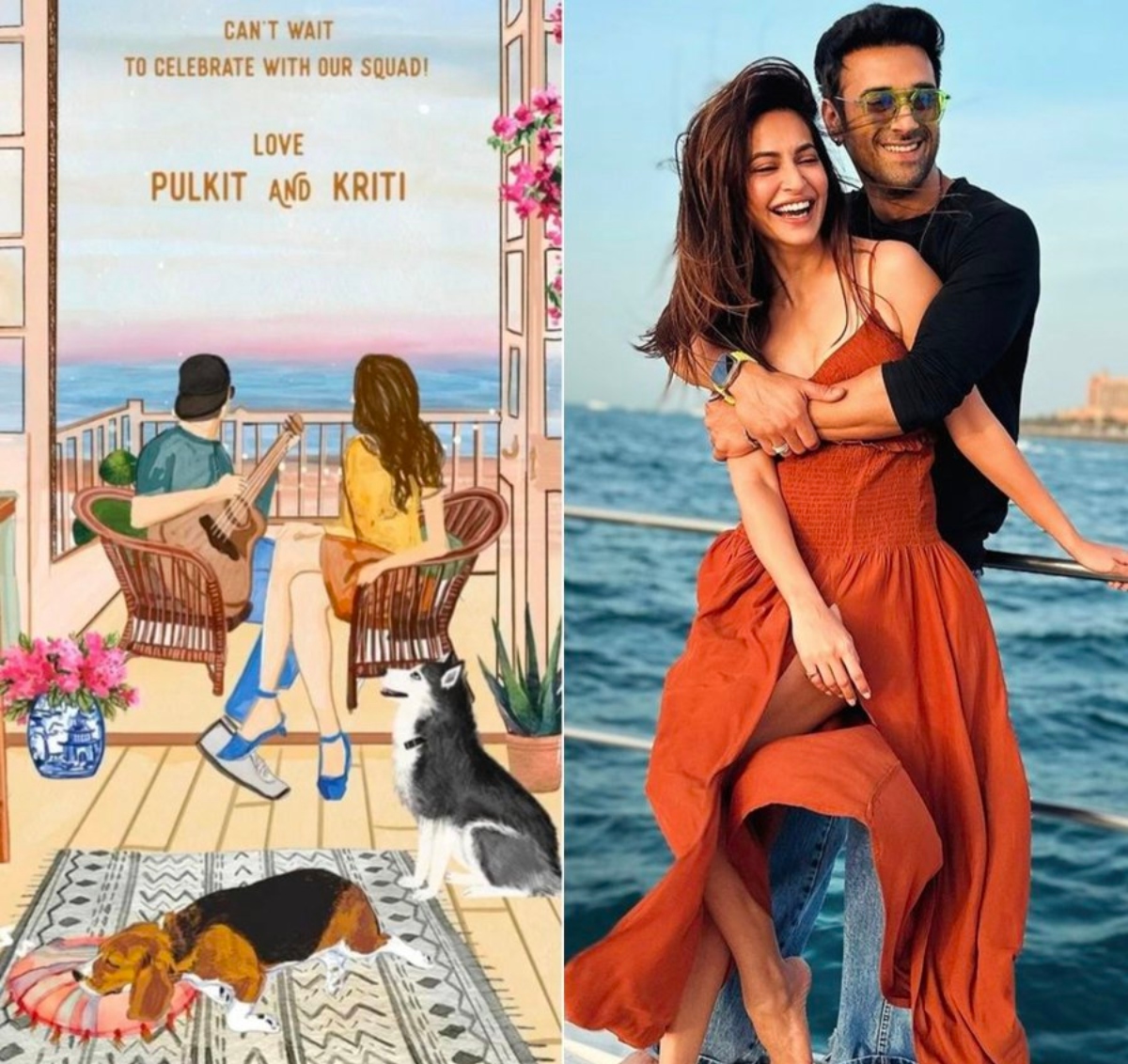 ये कपल पंजाबी रीति-रिवाज से शादी के बंधन में बंधने वाला है। पुलकित-कृति का वेडिंग कार्ड क्यूट होने के साथ-साथ बेहद यूनिक भी है। ये वेडिंग कार्ड होम थीम पर बना हुआ है, जिसमें एक लड़का और एक लड़की चेयर पर बैठे हुए नजर आ रहे हैं। दोनों बालकनी में बैठकर समुद्र की लहरों को निहार रहे हैं।