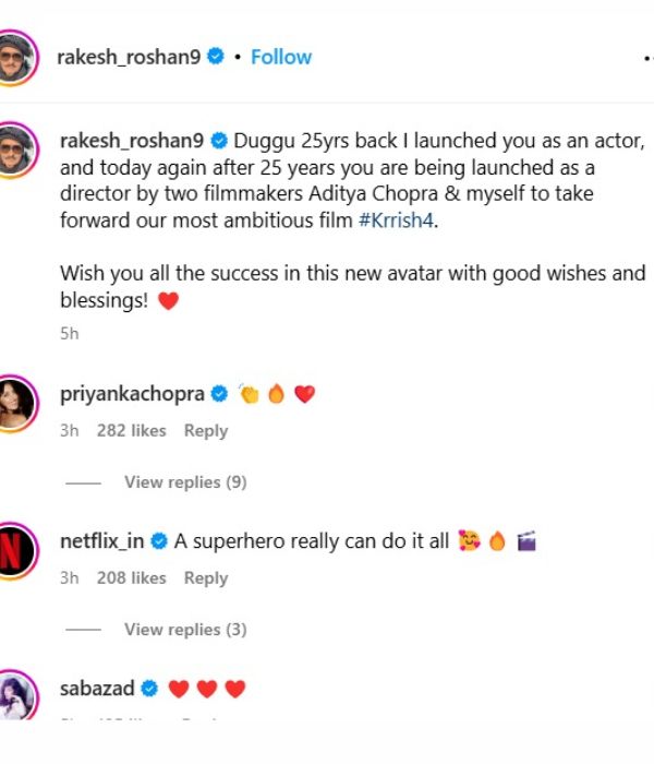 राकेश रोशन की पोस्ट पर फैंस से लेकर फिल्मी दुनिया के सितारे रिएक्ट करते नजर आ रहे हैं। हालांकि, एक्ट्रेस प्रियंका चोपड़ा के कमेंट ने हर किसी का ध्यान आकर्षित किया है। उन्होंने ताली बजाने वाली और रेड हार्ट इमोजी पोस्ट की है। इससे पता चल गया है कि कृष 4 के अपडेट के बारे में जानकर एक्ट्रेस को खुशी हुई है। फैंस ने उनका पोस्ट देखकर फिल्म में उनकी एंट्री का अंदाजा लगाना शुरू कर दिया है।