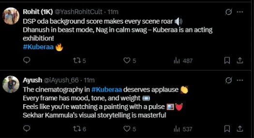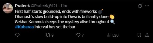 एक यूजर ने लिखा, "पहला भाग जमीनी स्तर पर शुरू होता है, और आतिशबाजी के साथ समाप्त होता है। धनुष का देवा के किरदार में धीरे-धीरे ढलना शानदार है। शेखर कम्मुला ने रहस्य को पूरे समय जीवित रखा है। #कुबेर ने इंटरवल तक एक मानक स्थापित कर दिया है।