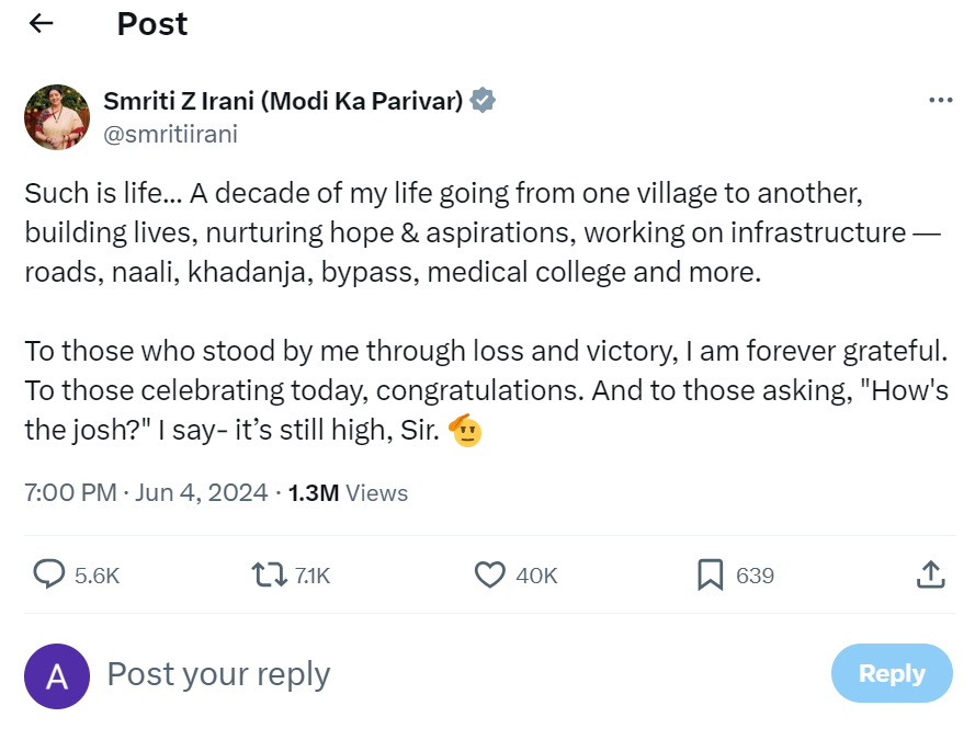 अमेठी में हार के बाद स्मृति ईरानी ने सोशल मीडिया पर पोस्ट कर लिखा, "जीवन कुछ ऐसा रहा... मेरे जीवन का एक दशक एक गांव से दूसरे गांव जाते हुए, जिंदगी संवारते हुए, उम्मीदें और आकांक्षाएं जगाते हुए, इनफ्रास्ट्रक्चर पर काम करते हुए, सड़कों, नालियों, खड़ंजा, बाई पास, मेडिकल कॉलेज और बहुत कुछ करते हुए बीता।