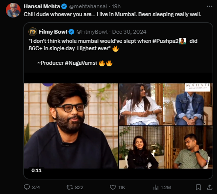 नागा वामसी के राउंड टेबल पर दिए गए इस बयान के वायरल होने के बाद हंसल मेहता ने अपना गुस्सा व्यक्त करते हुए लिखा, "तुम जो भी हो चिल मारो डूड...मैं मुंबई में रहता हूं और बहुत अच्छे से सोया हूं"।