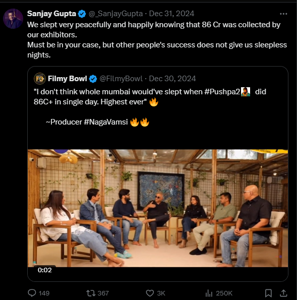 संजय गुप्ता ने लिखा, "हम बहुत ही चैन से सोए, क्योंकि हमें ये पता है कि 86 करोड़ हमारे एग्जीबिटर ने कमाए हैं। आपके केस में ये होता होगा, लेकिन हमें दूसरों की सफलता देखकर भी अच्छा ही लगता है।