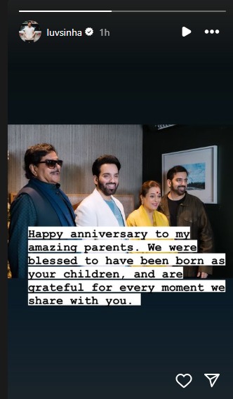फोटो शेयर करते हुए लव ने लिखा,“मेरे अमेजिंग माता-पिता को एनिवर्सरी की बहुत सारी शुभकामनाएं। हमे आपके बच्चे होने पर गर्व है। आपके साथ साझा किए गए हर पल के लिए आभारी हैं।"