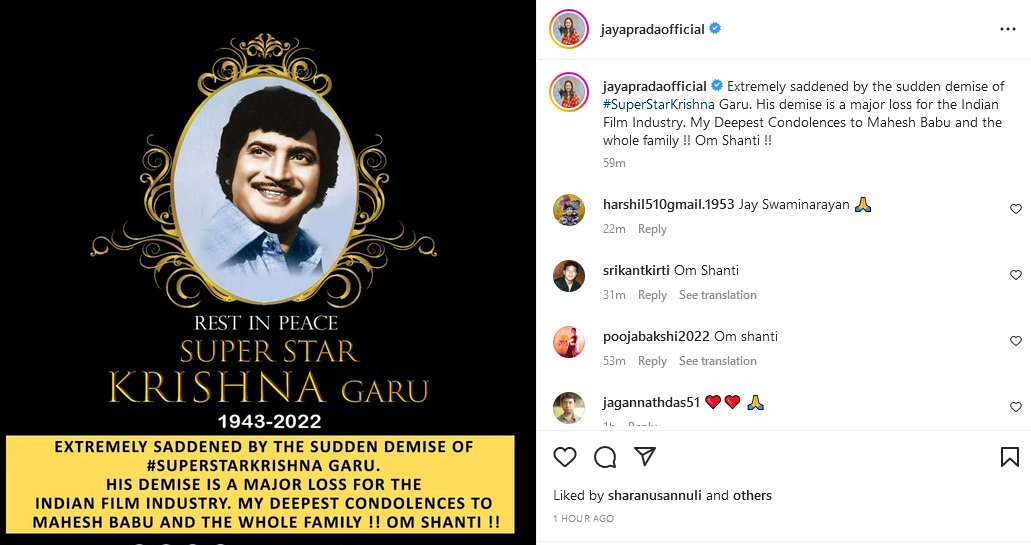 कृष्णा गारू के निधन से एक्ट्रेस जया प्रदा भी काफी दुखी हैं। जया ने कृष्णा के साथ कई फिल्मों में काम किया है। उन्होंने इंस्टाग्राम पर कृष्णा की तस्वीर पोस्ट करते हुए लिखा, 'सुपरस्टार कृष्णा गारू के आकस्मिक निधन से अत्यंत दुखी हूं। उनका निधन भारतीय फिल्म उद्योग के लिए एक बड़ी क्षति है। महेश बाबू और पूरे परिवार को मेरी गहरी संवेदना !! शांति !!'