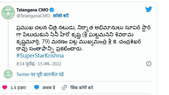 सुपरस्टार कृष्णा घट्टामनेनी के निधन पर तेलंगाना के मुख्यमंत्री के चंद्रशेखर राव ने ट्वीट कर उन्हें श्रद्धांजलि दी है।