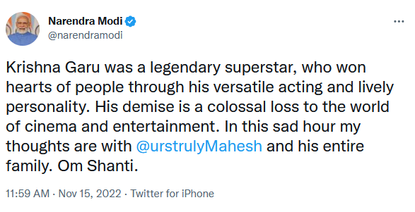 A legend like no other, Krishna Garu taught us what the aura of “Superstar” truly means. My father was one of his biggest fans. No words to express the immense loss we all feel right now. My prayers are with @urstrulyMahesh sir, his entire family and fans 🙏.