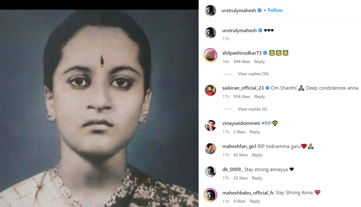 महेश बाबू ने बिना कुछ कहे मां के लिए अपना प्यार जाहिर किया है। उन्होंने दिवंगत इंदिरा देवी की ब्लैक एंड व्हाइट फोटो शेयर करते हुए हार्ट इमोजी बनाई है।