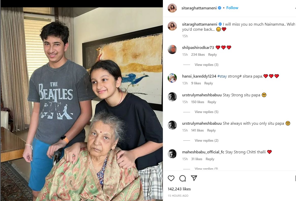 दादी मां के जाने पर महेश बाबू की बेटी सितारा को भी बड़ा धक्का लगा है। सितारा, इंदिरा देवी के काफी करीब थीं। दादी मां के निधन पर सितारा ने इंस्टाग्राम पर उनके साथ अपनी फोटो को शेयर करते हुए लिखा, 'मैं आपको बहुत मिस करूंगी दादी...काश की आप वापस आ पातीं।'