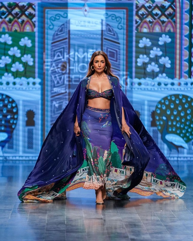 मलाइका अरोड़ा ने ब्लू कलर की ब्रालेट और स्कर्ट पहन रखी है
