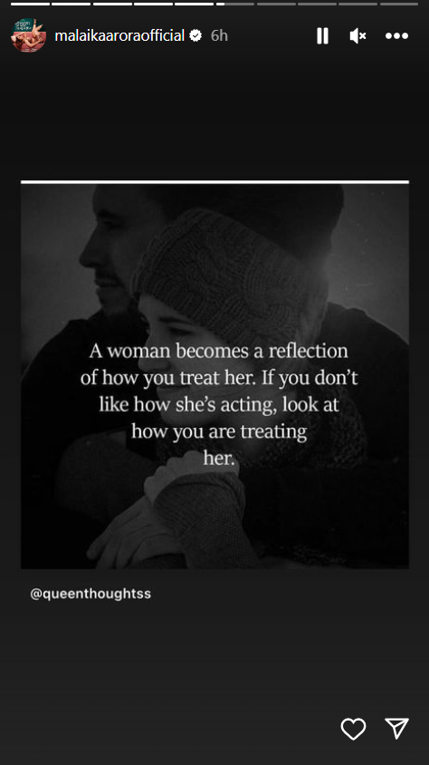 मलाइका ने अपनी इंस्टाग्राम स्टोरीज पर एक पोस्ट शेयर किया जिसमें लिखा, ''एक महिला इस बात का प्रतिबिंब बन जाती है कि आप उसके साथ कैसा व्यवहार करते हैं। यदि आपको उसका व्यवहार पसंद नहीं है, जैसा वह कर रही है, तो यह देखें कि आप उसके साथ कैसा व्यवहार कर रहे हैं।''