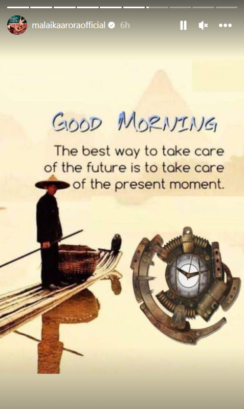 इसके अलावा मलाइका ने दूसरा पोस्ट गुड मॉर्निंग का साझा किया, जिसमें लिखा था, ''भविष्य का ख्याल रखने का सबसे अच्छा तरीका वर्तमान पल का ख्याल रखना है।'' बता दें कि उनके ब्रेकअप की अफवाहें तब उड़ने लगी थीं, जब सोशल मीडिया पर अर्जुन ने अपनी सोलो ट्रिप की तस्वीरे पोस्ट की थी और अर्जुन की इन फोटोज को मलाइका ने न तो लाइक किया था और न ही कोई कमेंट किया था।